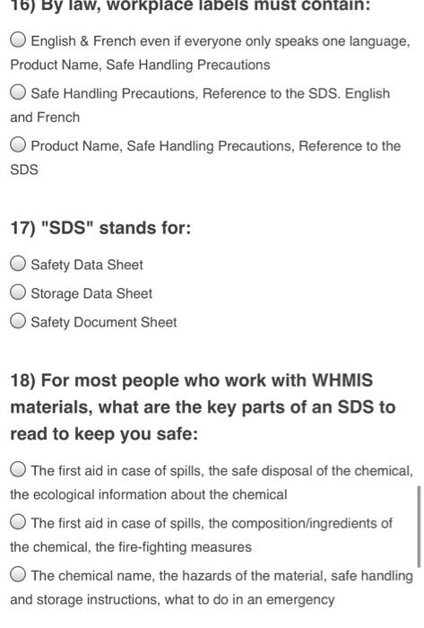 What must chemical labels contain. Chemical Hazards and Toxic Substances - Overview ... All employers with hazardous chemicals in their workplaces must have labels and safety data sheets for their exposed workers, and train them to handle the chemicals appropriately. The training for employees must also include information on the hazards of the chemicals in their work area and the measures to be used to protect themselves. WorkSafeBC This worker must not be exposed to an average of more than (3 X 0.0125 =) 0.0375 mg/m 3 for more than a total of 30 minutes during the 12-hour work period. The worker must not be exposed to more than (5 X 0.0125 =) 0.0625 mg/m 3 at any time during the 12-hour work period. G5.50 Extended work periods. Issued August 1, 1999; Revised February 11, 2004 Understanding Chemical Hazard Labels and MSDS Users must also have the Material Safety Data Sheets (MSDS) on hand for all chemicals they use. The MSDS contain detail information on: • Name & trade name of the substance • Hazardous ingredient(s) it contains • Physical characteristics of the chemical • Protective equipment to be used • What to do in event of a leak or spill 1910.1030 - Bloodborne pathogens. | Occupational Safety and ... Warning labels shall be affixed to containers of regulated waste, refrigerators and freezers containing blood or other potentially infectious material; and other containers used to store, transport or ship blood or other potentially infectious materials, except as provided in paragraph (g)(1)(i)(E), (F) and (G).